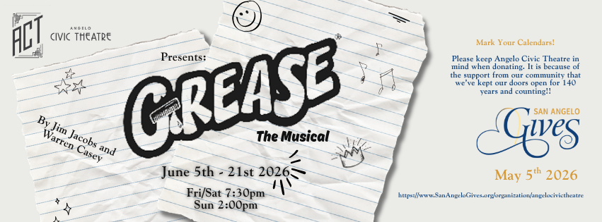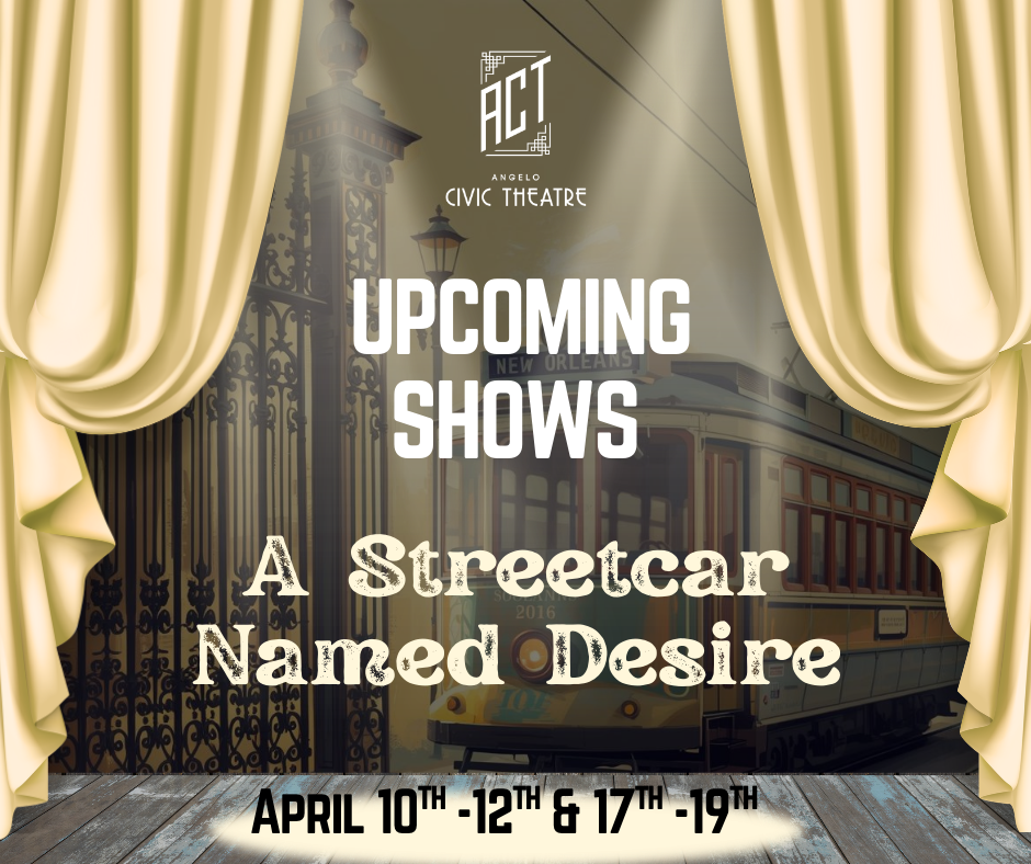 Formed in 1885, Angelo Civic Theatre is a nonprofit, volunteer-based community theatre aiming to culturally enrich, educate, and entertain. ACT’s survival and success depend on the wonderful community we serve. And because of this, Angelo Civic Theatre is a vivid, living testament to the artistic spirit of the San Angelo people.