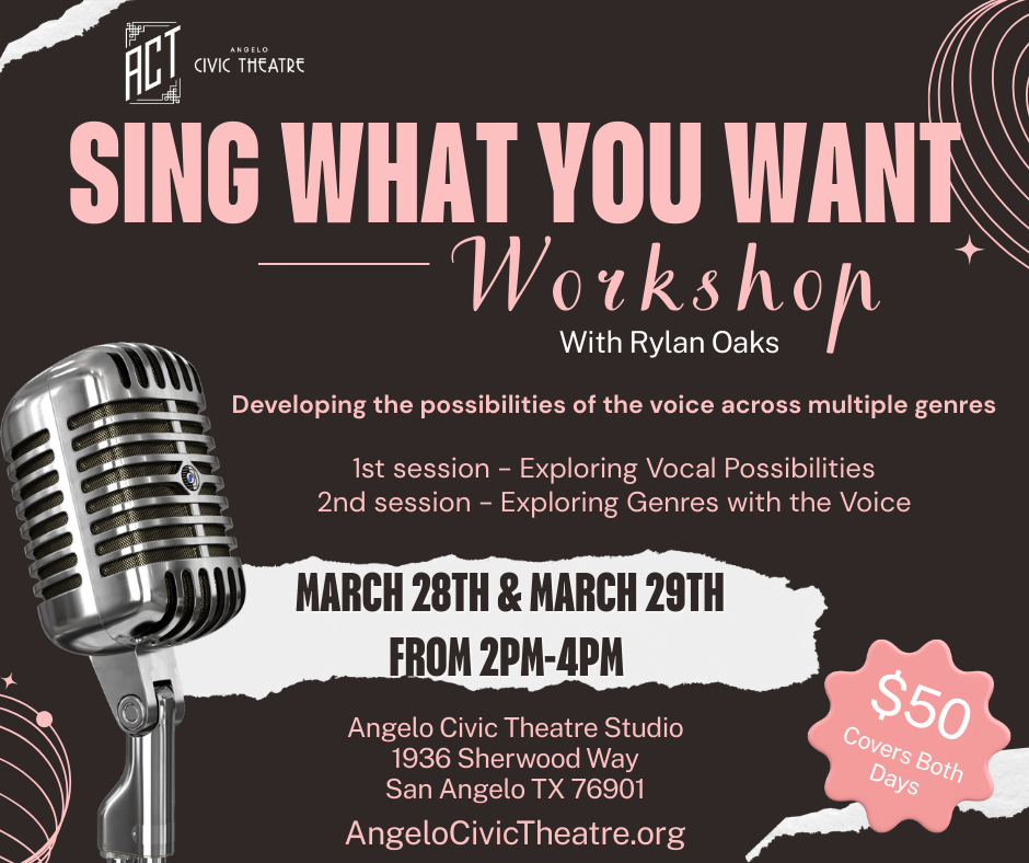 Rylan Oaks is a born-and-raised San Angelo singer and vocal coach. He has lent his voice to various platforms of performance as a rock band frontman, main-stage musical theatre actor, and professional vocalist on cruise destinations around the world. He believes his career is proof that you can train your voice to do more than you ever imagined!